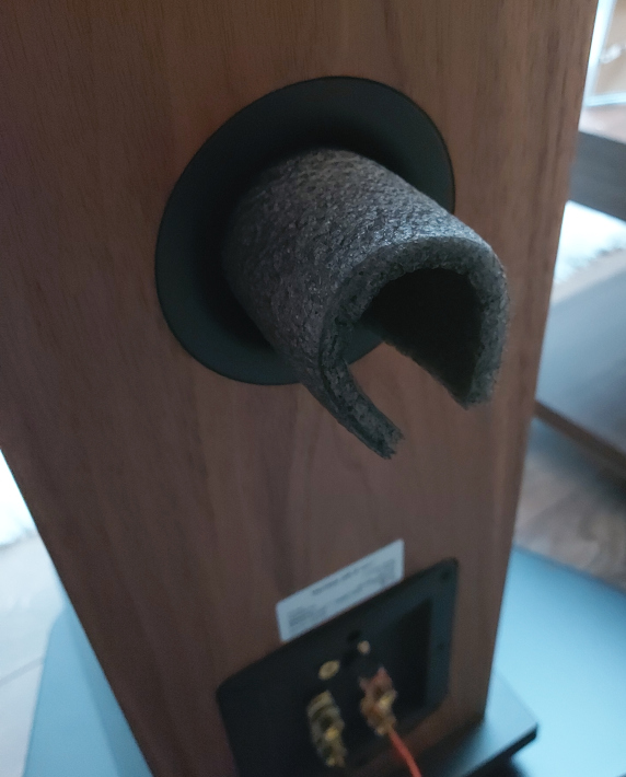 Mivel a p6.2 két és fél utas kialakítású és a két mélyközép hangszóró külön kamrában foglal helyet, itt két reflexport is van, a lehetőségek még tágabbak. Eleinte a portok bedugásával kísérleteztem, végül egy speciálisabb megoldást találtam. Egy tekercs szigetelőből különféle hosszúságú darabokat vágtam le és így ki tudtam próbálni, mi van ha teljesen eltömítem a reflexportot, majd pedig fokozatosan egyre nagyobb lyukat hagyok az összetekert szigetelő közepén. A legobb eredményt a méréseim alapján ez a megoldás adta az alsó reflexportban (a felsőt üresen hagytam):